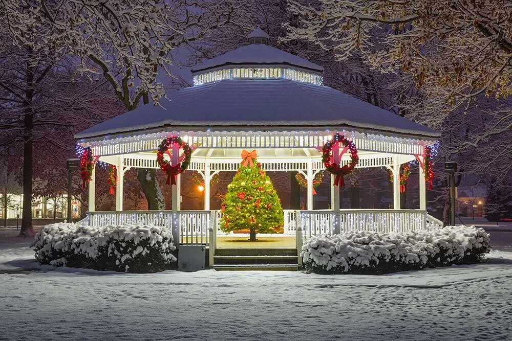This fine art photography print captures the warmth and beauty of the holiday season. A tranquil beaver gazebo is adorned with a towering Christmas tree, adorned with festive lights and wrapped presents. Perfect for any wall, this classic print will bring a touch of joy to any room.